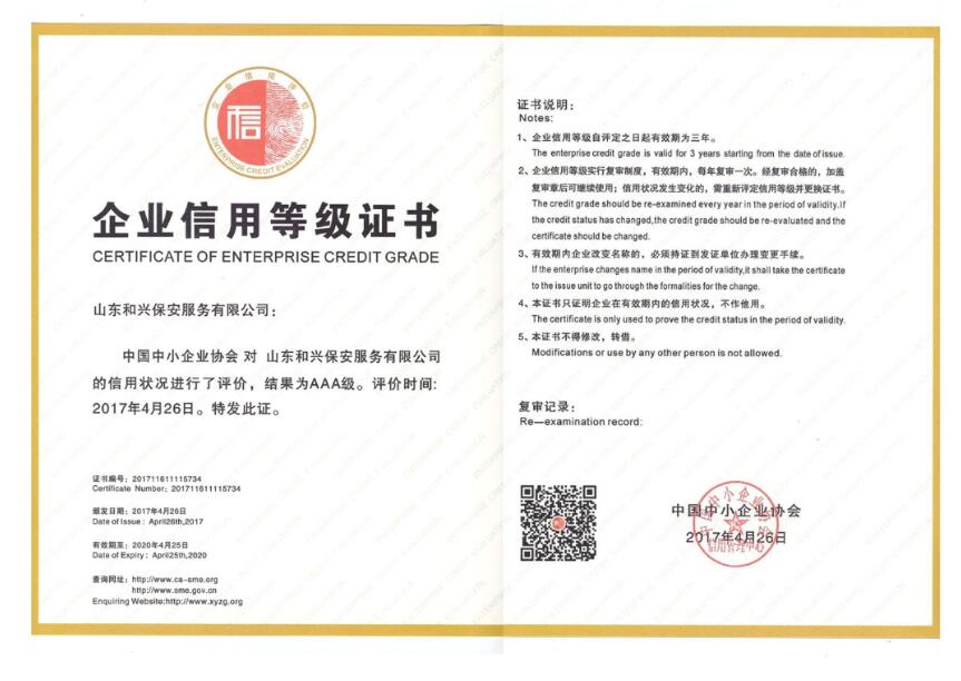 山東和興保安服務(wù)有限公司成立于2013年5月,注冊(cè)資金1000萬(wàn)元人民幣,山東省公安廳批準(zhǔn)的專(zhuān)業(yè)化保安服務(wù)公司,國(guó)家AAA級(jí)信用企業(yè),中國(guó)保安協(xié)會(huì)會(huì)員單位,青島市保安協(xié)會(huì)副會(huì)長(zhǎng)單位。公司先后榮獲“山東省優(yōu)秀保安公司”、“山東省抗擊疫情表現(xiàn)突出保安公司”、“青島市綜合治理先進(jìn)單位”、“青島市企業(yè)勞動(dòng)爭(zhēng)議調(diào)解組織建設(shè)示范單位”、“青島市守合同重信用企業(yè)”、“青島市勞動(dòng)關(guān)系和諧企業(yè)”......